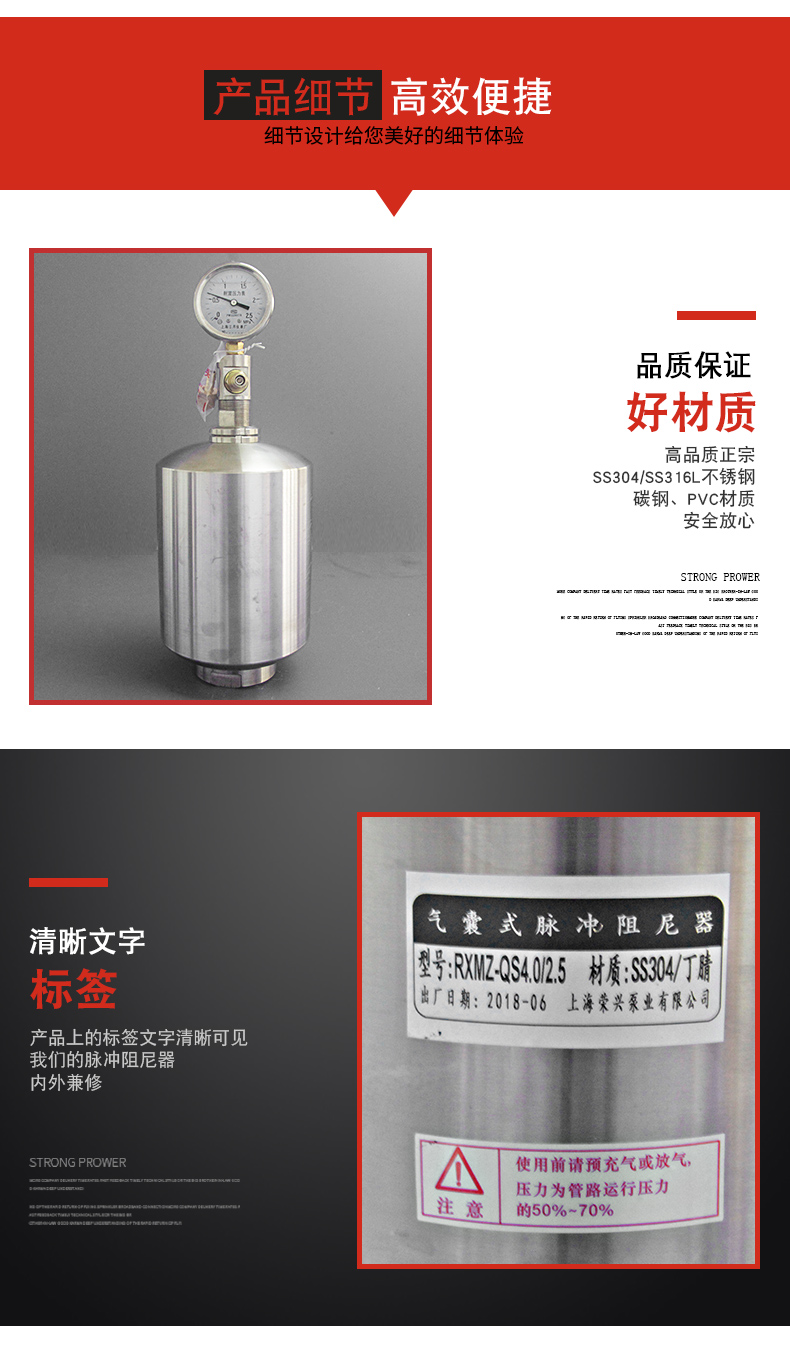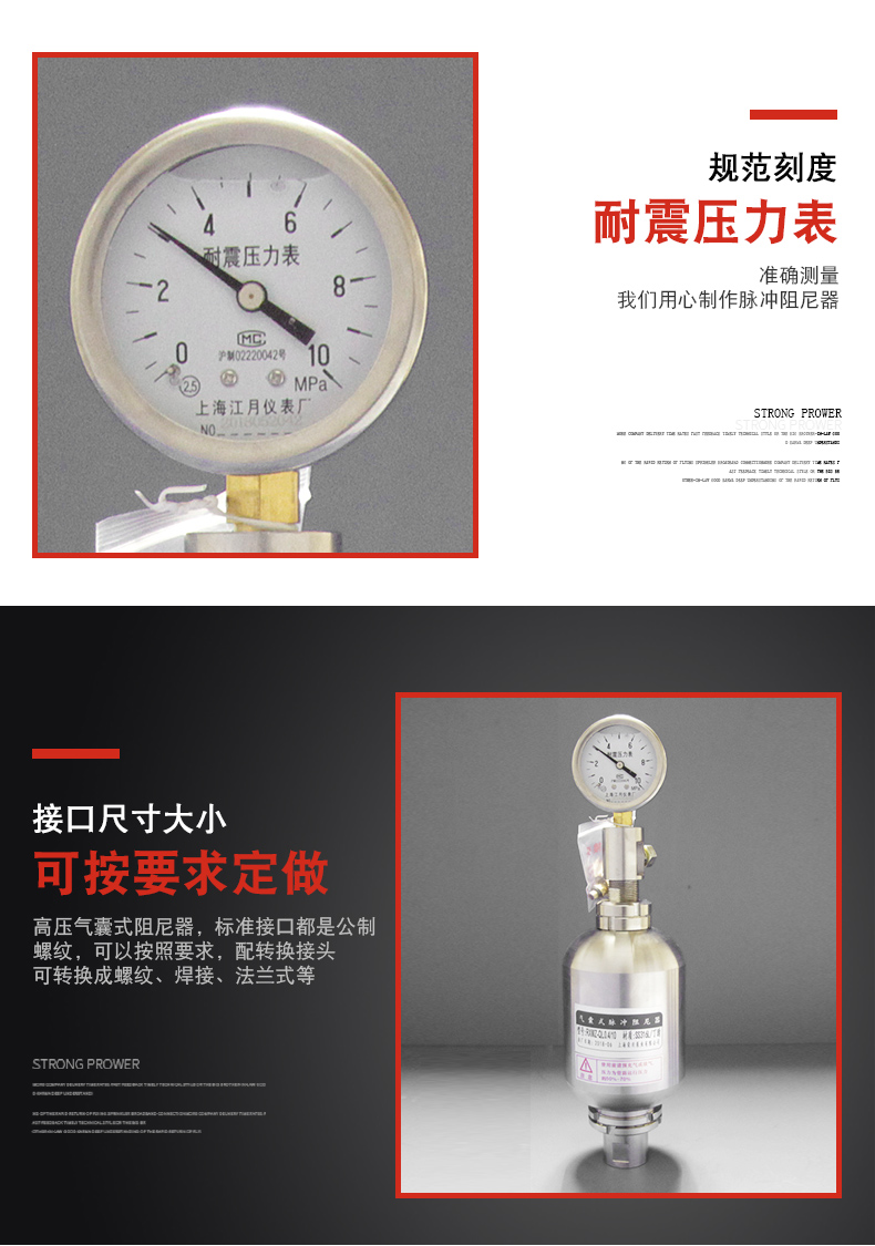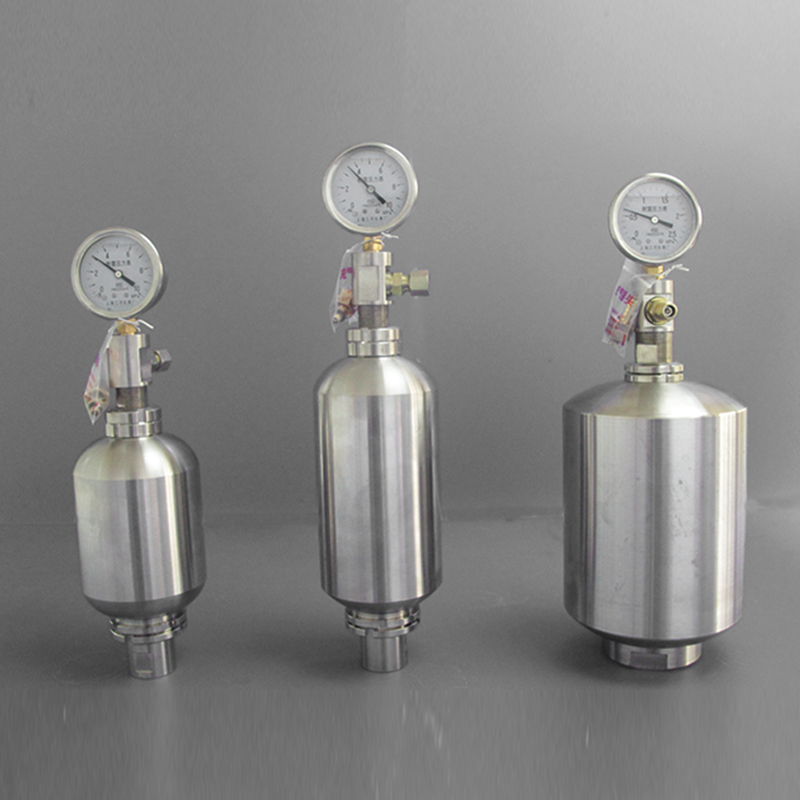 氣囊式脈沖阻尼器的特點是靈敏度高,消除脈沖效果更好,能夠承受較高的壓力(我公司生產(chǎn)的氣囊式脈沖阻尼器最大耐壓31.5MPa),其結(jié)構(gòu)是在空氣罐內(nèi)加一個氣囊,氣囊內(nèi)充入一定壓力的氣體,在管路中,管路中的液體壓縮氣囊,氣囊收縮,然后擴張,從而起到緩沖效果。和膜片式相比較,氣囊式脈沖阻尼器的靈敏度更高,緩沖效果更好,但是因其氣囊材質(zhì)一般為橡膠材質(zhì),所以其使用范圍沒有膜片式廣,其選型方法是泵每次沖程的容積數(shù)乘以10,即得到能減小90%脈沖的最小容積數(shù)。