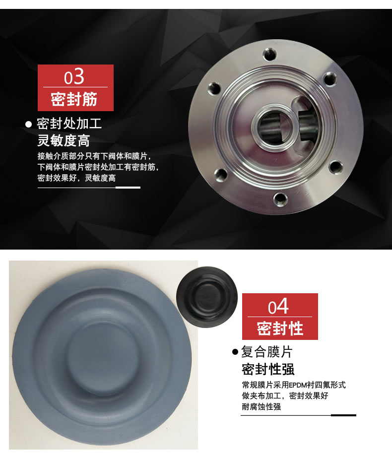 •常規(guī)膜片采用EPDM襯四氟形式,做夾布加工,密封效果好,使用壽命高;純四氟膜片耐溫高、耐腐蝕性強(qiáng)