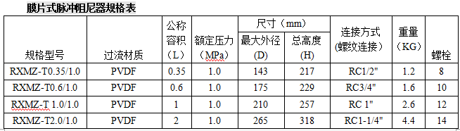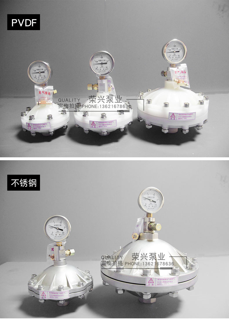 膜片式脈沖阻尼器分為上下殼體,中間由聚四氟乙烯&橡膠復(fù)合膜片分隔,是最常用的脈沖阻尼器。最大的優(yōu)點就是隔膜將預(yù)充氣體和管路中的液體分開,方便維護(hù),在合適的選型、充壓條件下,能夠減少絕大多數(shù)的脈沖。我公司生產(chǎn)的膜片式脈沖阻尼器PVC材質(zhì)的最大耐壓為1.0MPa,不銹鋼材質(zhì)最大耐壓一般為2.5MPa,最高耐壓5.0MPa。